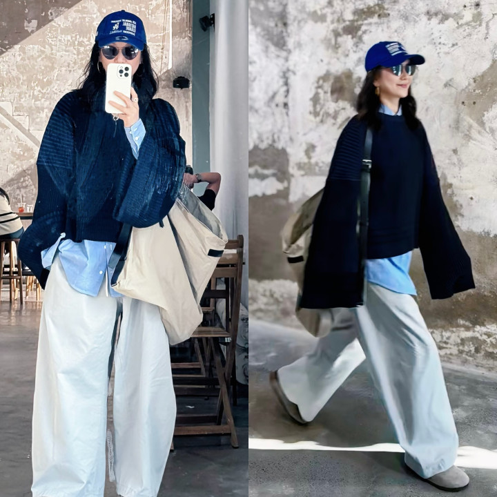 比如↓这位50+博主,宽松的藏蓝色毛衣,内搭蓝衬衫叠穿,搭配一条浅灰色失业裤,全身搭配偏宽松。头上的棒球帽和肩上挎的大帆布包与造型很好呼应,进一步强调慵懒年青气质,松弛感拉满。