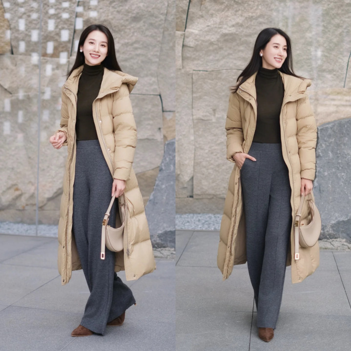 底下来望望几款长款羽绒服+阔腿裤的穿搭案例:
