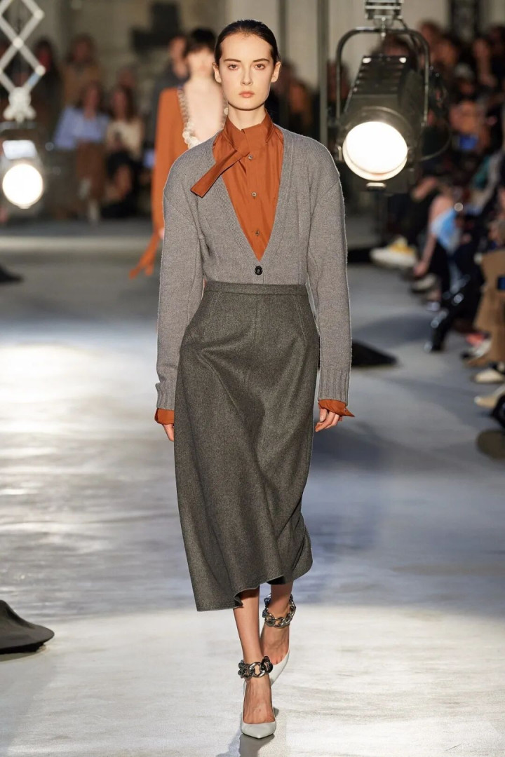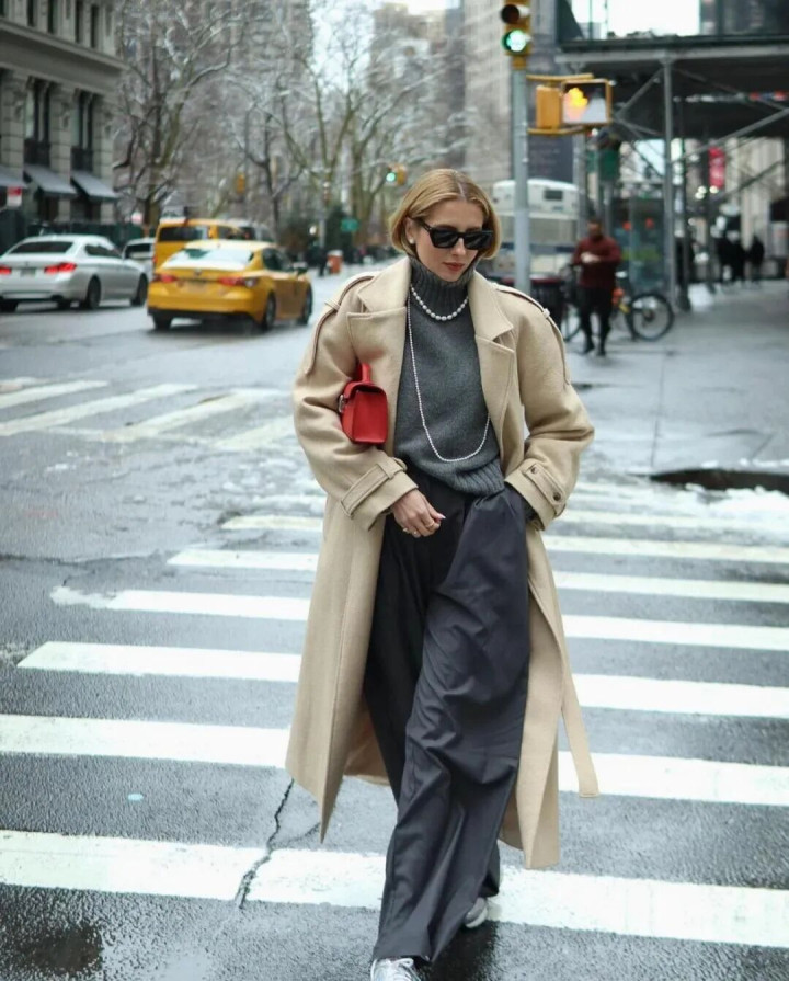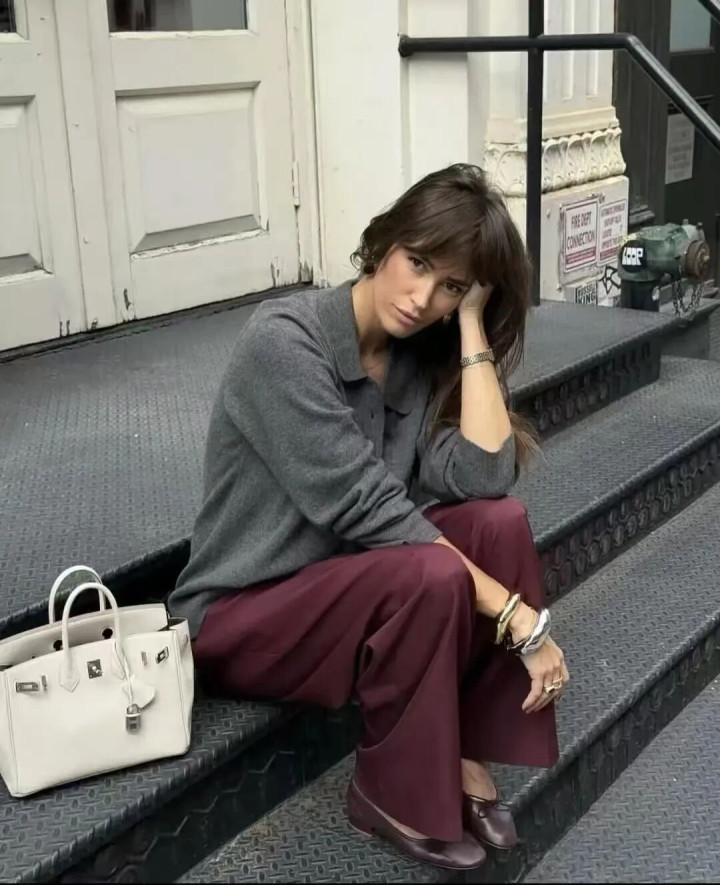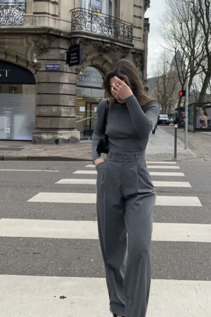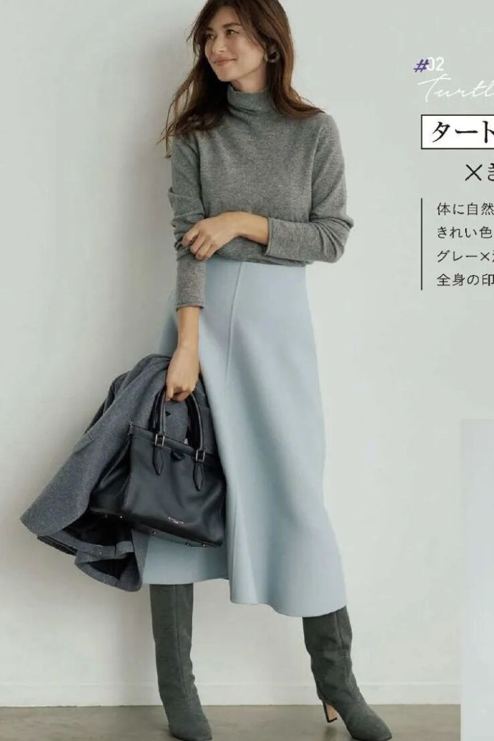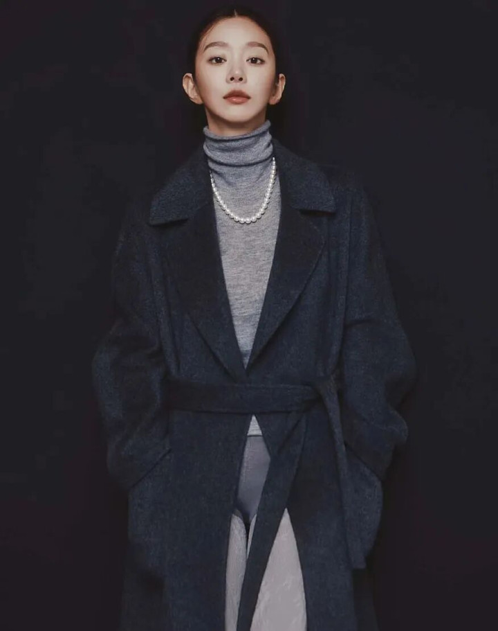 灰调高领衬着肤色,冷白皮是蟾光,暖黄皮也透出温润,像古书页泛出的黄,经得起时刻。