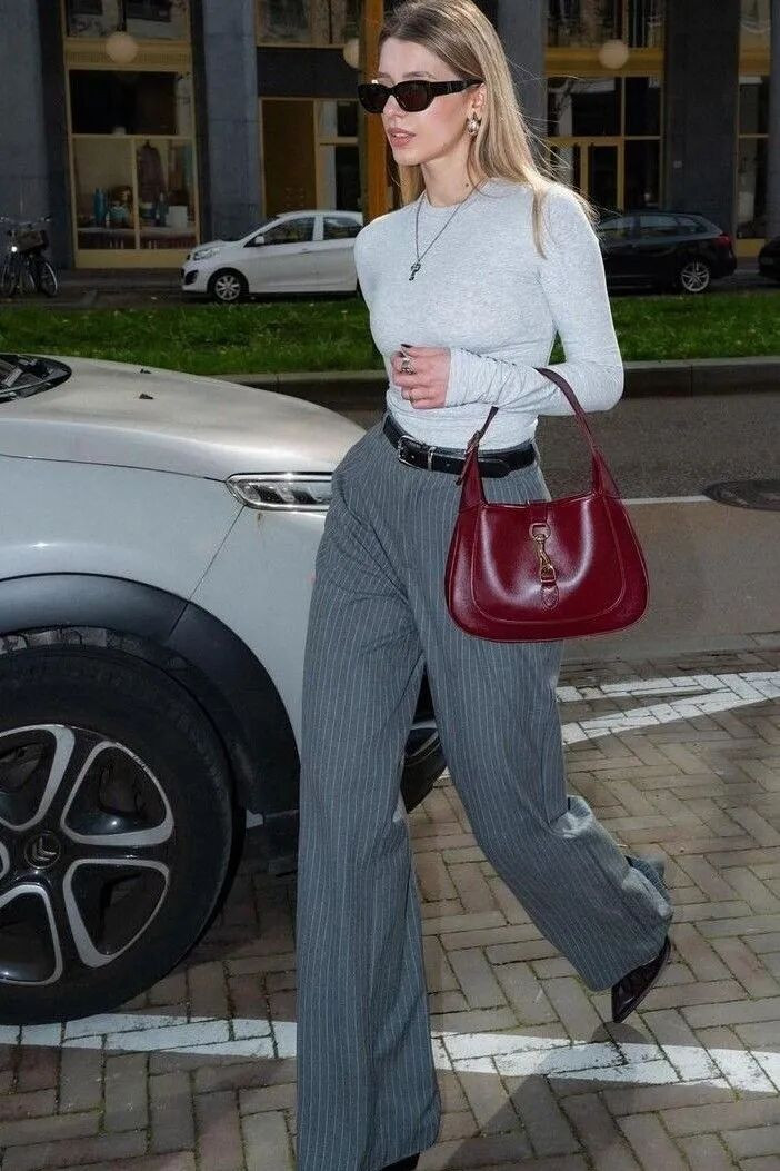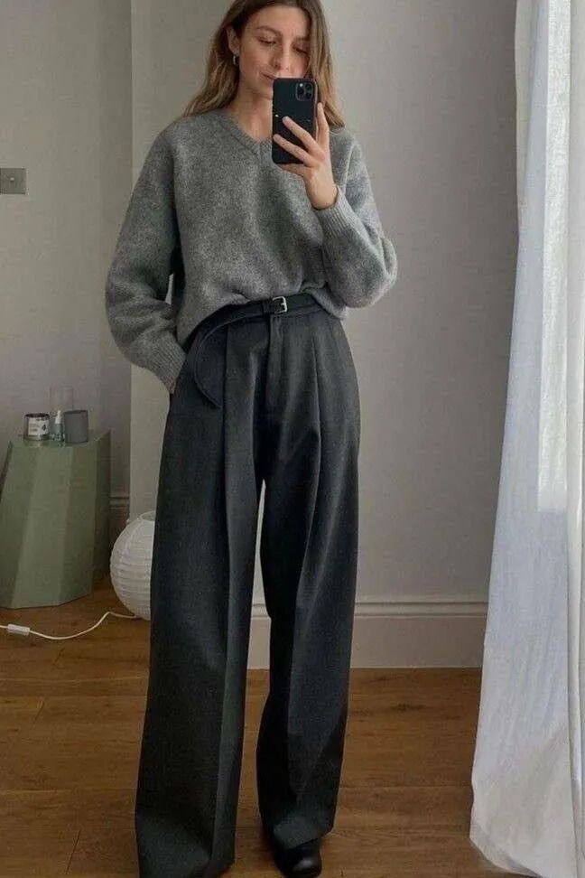 若把宽松毛衣的一角塞进高腰阔腿裤里,再系上一条窄腰带,那所有这个词搭配立时就会变得更有范。