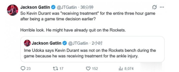 按照杜兰特的伤势,即便攥紧时分诊治,也不成能在一周内全齐康复,是以他在G3莫得出当今替补席,大致依然能证据问题,休斯顿活命参加倒计时!此前,火箭记者Gatlin公开怒喷杜兰特,“乌度卡说杜兰特莫得出当今场边是去承袭诊治了,需要诊治3个小时?太丑陋了,他可能依然撤废了火箭”!