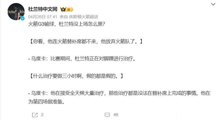 火箭处置层不错探求休赛期了,声势应该会发生雄壮的变化!耐东谈主寻味的是,杜兰特在上一场G3比赛,他并莫得出当今场边为队友们助阵,疑似出现内耗!据ESPN记者David McMenamin报谈,火箭球员以至不了了KD的伤势,他到底发生了什么?