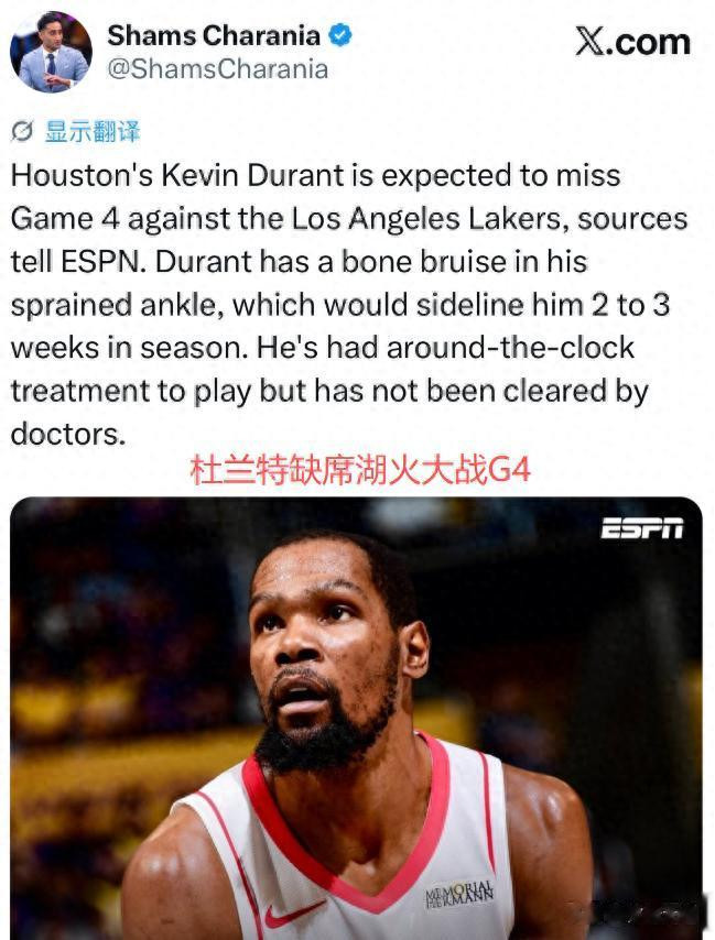 北京时分4月27日,NBA季后赛西部首轮G4,火箭主场迎战湖东谈主,这一场亦然的确的生苦战,输球就会被淘汰!据NBA名记Shams报谈,火箭坏音问传来,杜兰特连续缺席,并且KD的伤情比拟毒手,短时天职难以复出!