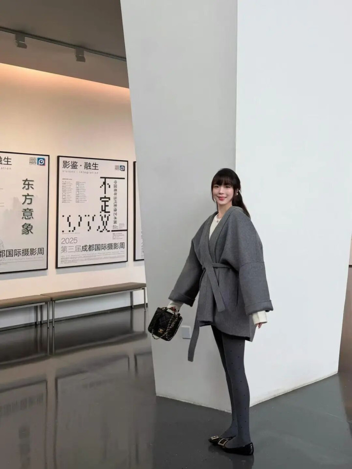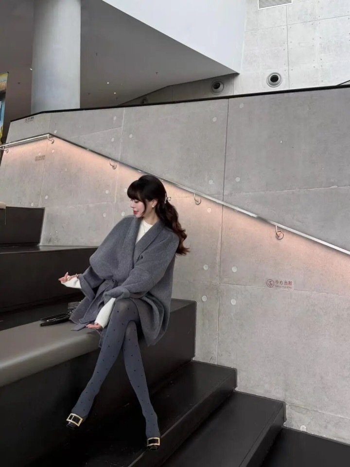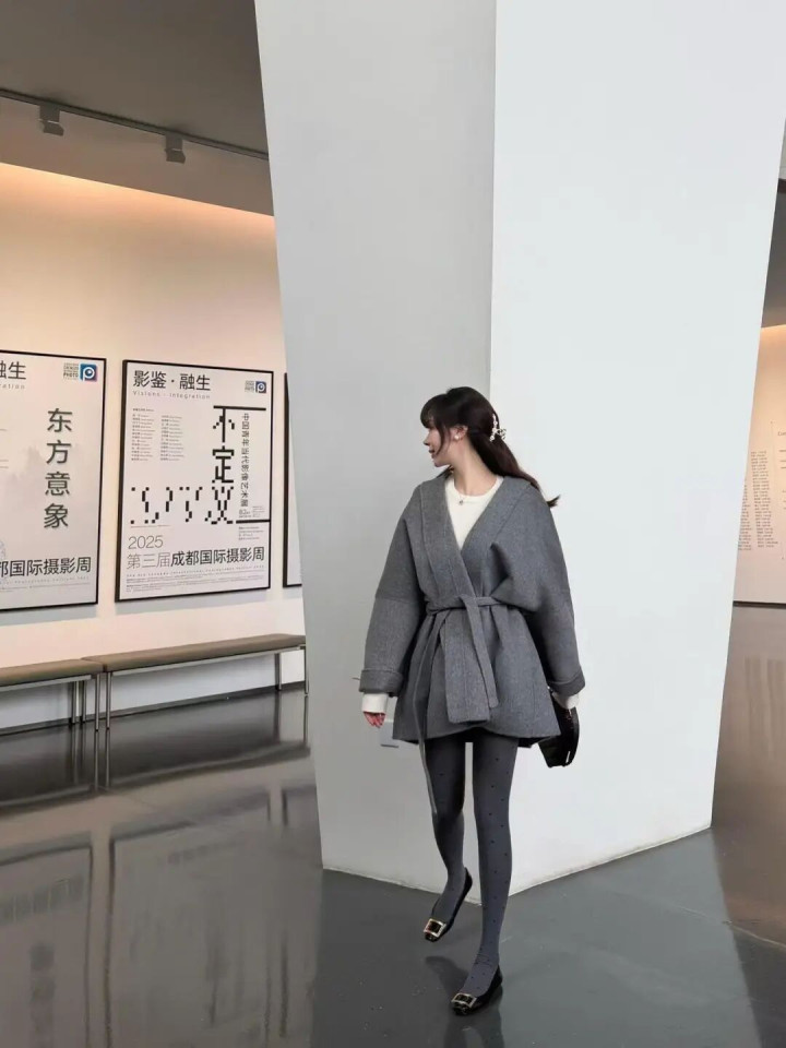 开云sports “灰色大衣+灰波点袜”, 优雅和蔼又灵动的厚灰好意思学穿搭