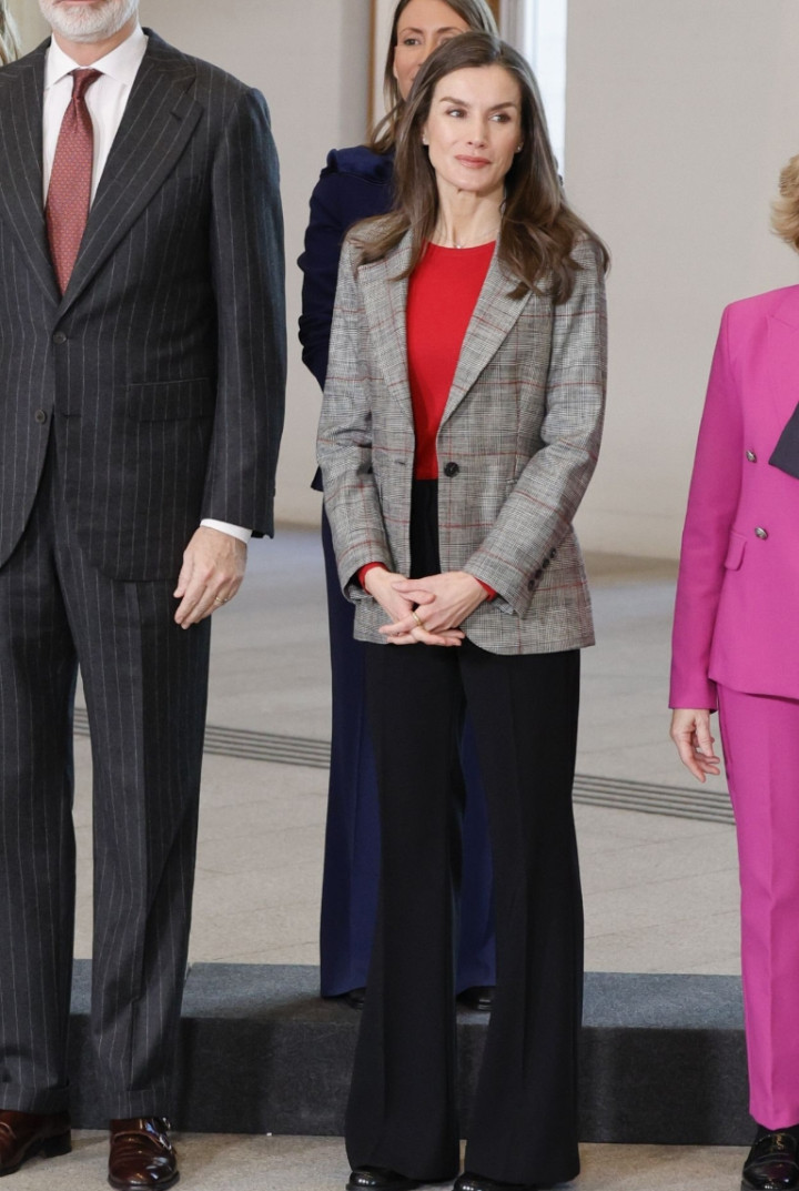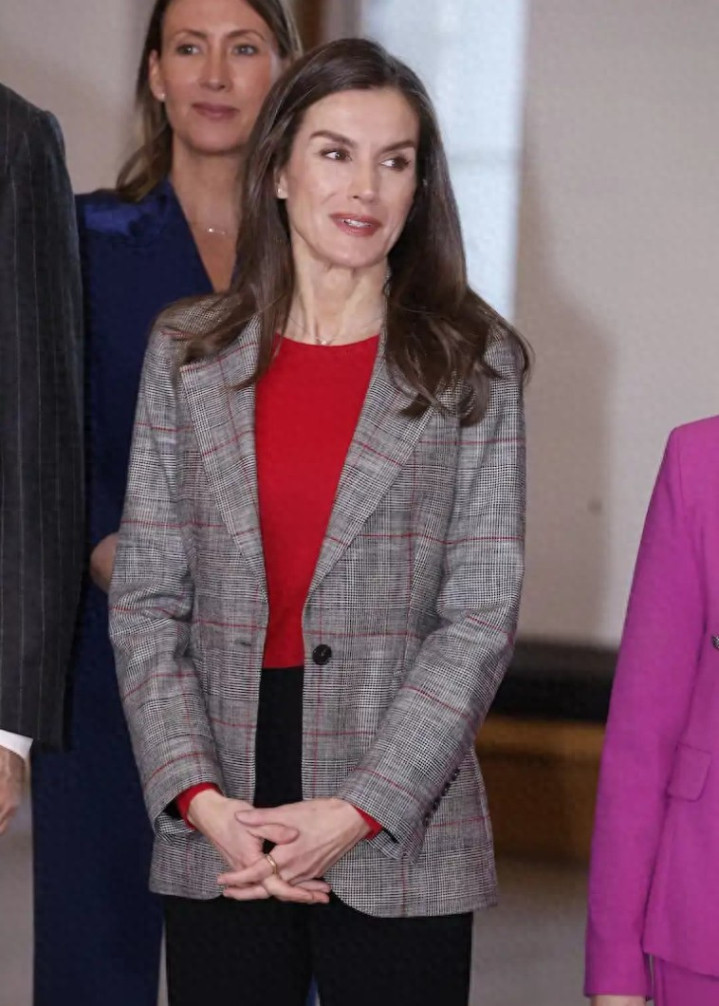 莱蒂皆亚身穿一件灰色格纹西装外衣,内搭一件红色古道打底衫,脖子上佩带了小钻石项链,灰色格纹外衣来自Carolina Herrera,2022年莱昂诺尔公主曾借穿过一次!