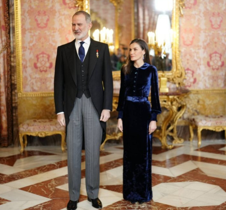 除了小香风连衣裙,费莱在马德里皇宫出席了一年一度的酬酢管待会,莱后重穿了她的蓝色丝绒长投降,佩带着和诺拉母女分享过的蓝坚持钻石吊坠耳饰!