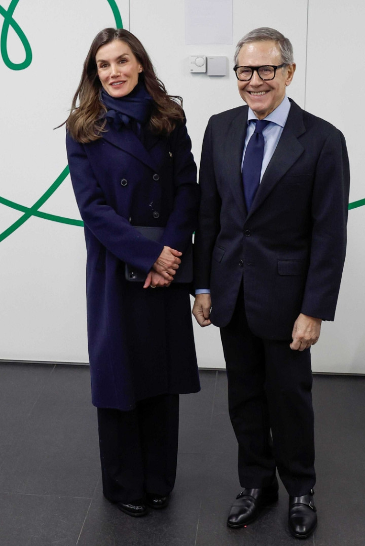 莱蒂皆亚王后身穿深蓝色双排扣毛呢大衣外衣,开云sports搭配蓝色系羊绒领巾,搭配长鬈发,造型太赞了。