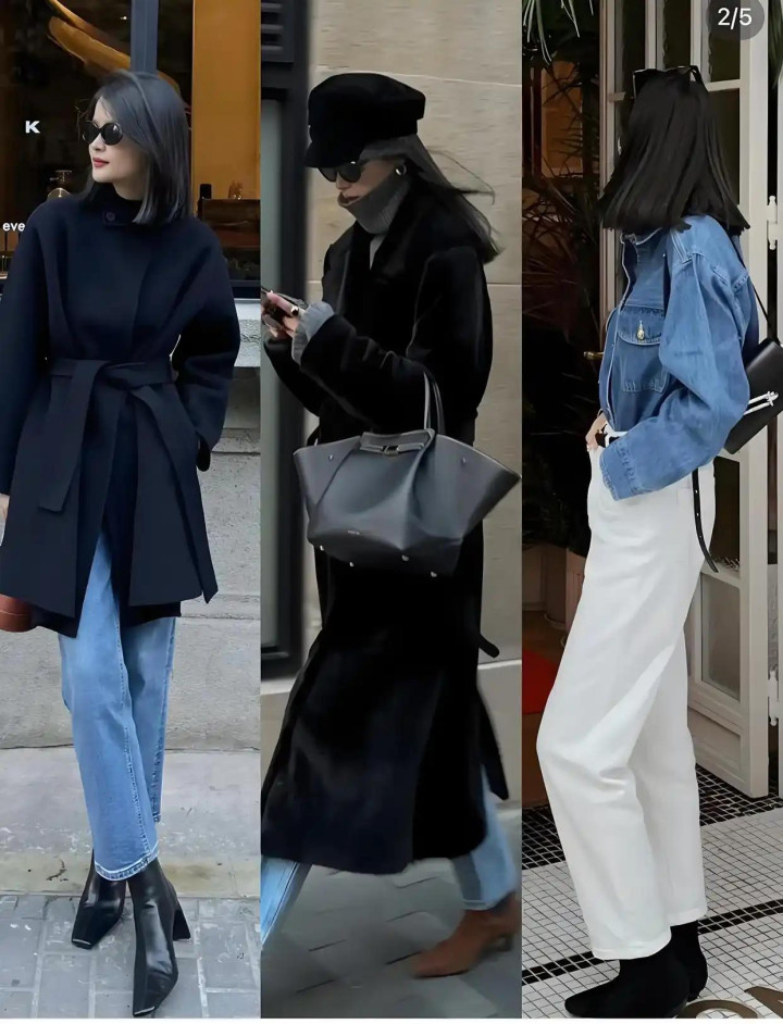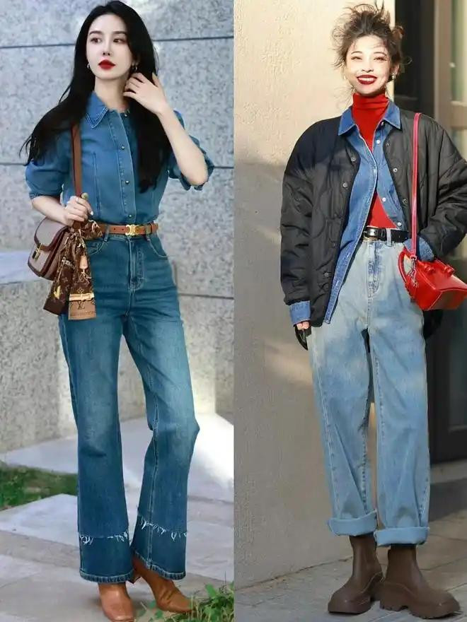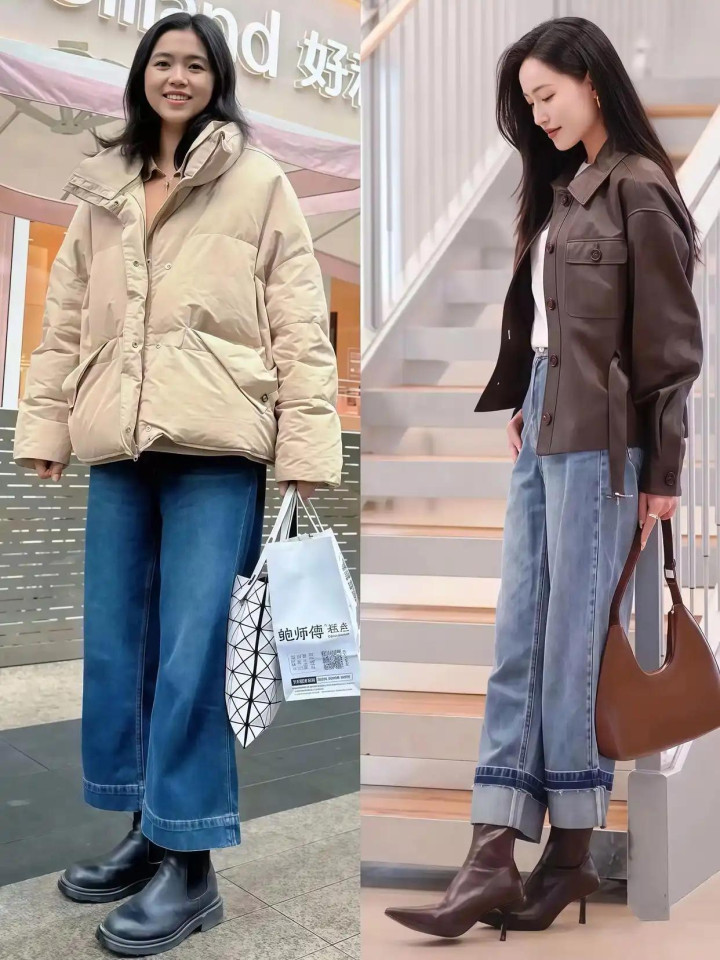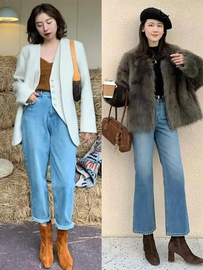 选这种裤子的时候,要瞩目牛仔布的厚度,太薄的牛仔布莫得型,穿上会往下坠,显得腿短,太厚的又会硬邦邦的,坐下去不酣畅,神采的话,中蓝色和深蓝色最百搭。