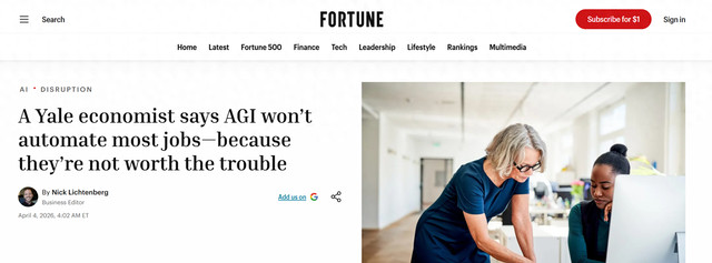 [环球网科技空洞报说念]4月5日音问,据《资产》杂志报说念,耶鲁大学经济学副种植帕斯夸尔・雷斯特雷波发布的最新商论说文指出,通用东说念主工智能(AGI)的发展不会导致大多数东说念主类责任被自动化替代,其中枢原因并非东说念主工智能智商不及,而是大齐责任对经济增长并非重要,不值得插足资源进行替代。