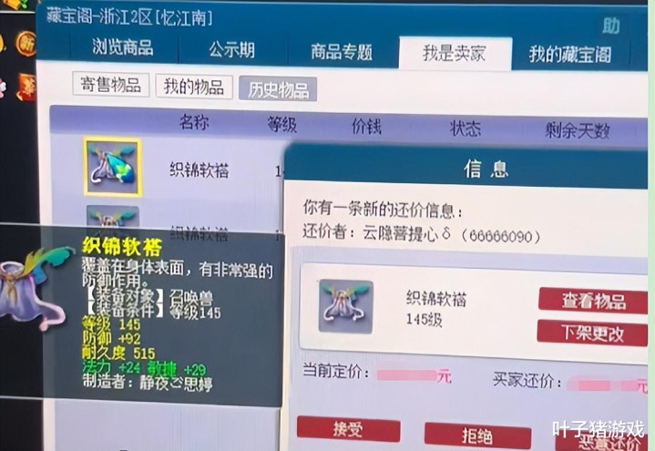 日前,一位玩家共享我方在藏宝阁售卖物品的资历。他所售卖的是下图这个敏法53的宝宝装备,一初始算是高价上架。