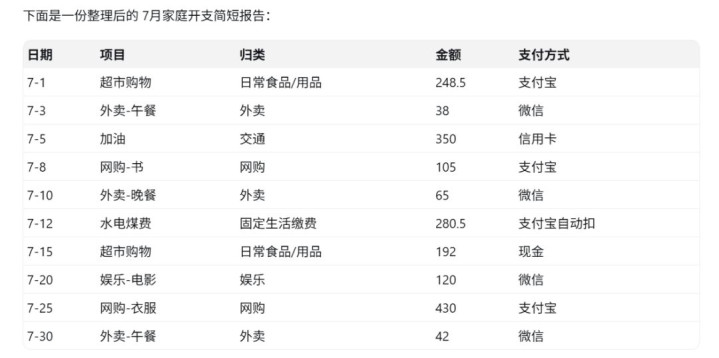 我们给GPT-5.5多条神色凌乱的单月开支数据,让其饰演家庭数据分析师,完成整理数据、计较总支拨、分析各支付款式占比、分类统计开销等任务,并最毕生成一份给家东谈主看的建议讲解。