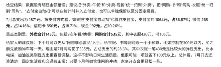 在分析中,它通过计较占比,指出“网购”(衣物、册本)类目支拨较高,且多为非急需品,因此建议为这类消费设立预算,Z6尊龙凯时官方网站给出的建议具体可行。临了生成的讲解也充满情面味,那句“略略管住网购的小冲动,我们家的开支就能更削弱一些”,合乎“给家东谈主看”的疏浚条目,口吻亲切,建议接地气。