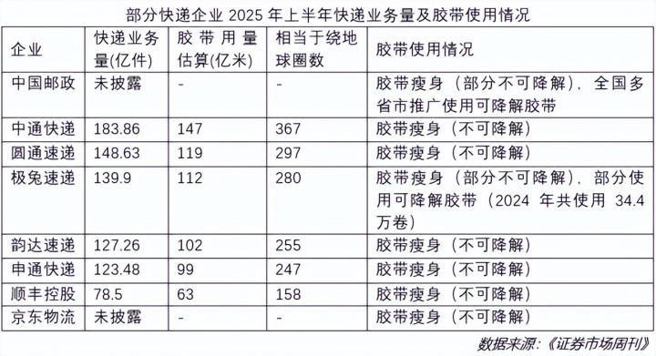 凭据国度邮政局数据,2025年快递包装圭臬化率已达86.8%,胶带宽度减量25%,免胶带纸箱占比2.7%,可降解包装占比擢升至10.27%,同城轮回包装愚弄比例超10%,回应原用纸箱超10亿个。中国邮政和极兔速递已率先延伸使用可降解胶带,固然举座占比仍不高,但为行业指明了发展主义。