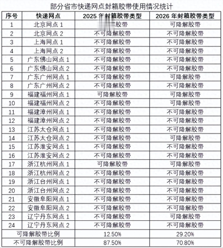 实地调研表露,新规实施仅两个多月,胶带绿色升级在“终末一公里”获得明显当先:在6省2市24个快递网点的跟踪造访中,使用可降解胶带的比例已从2025年的12.5%增长至2026年的29.2%,增幅高达133%。这一变化标明,越来越多的快递网点正在主动淘汰不行降解胶带,转而经受可降解胶带这一更环保的替代决议,快递包装的绿色化转型在“终末一公里”初见成效。