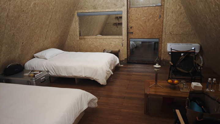 板屋内交接比拟精真金不怕火,两个木床中间是个大铝箱充任床头柜,上头放着哈曼卡顿的音响,雇主试吃可以!