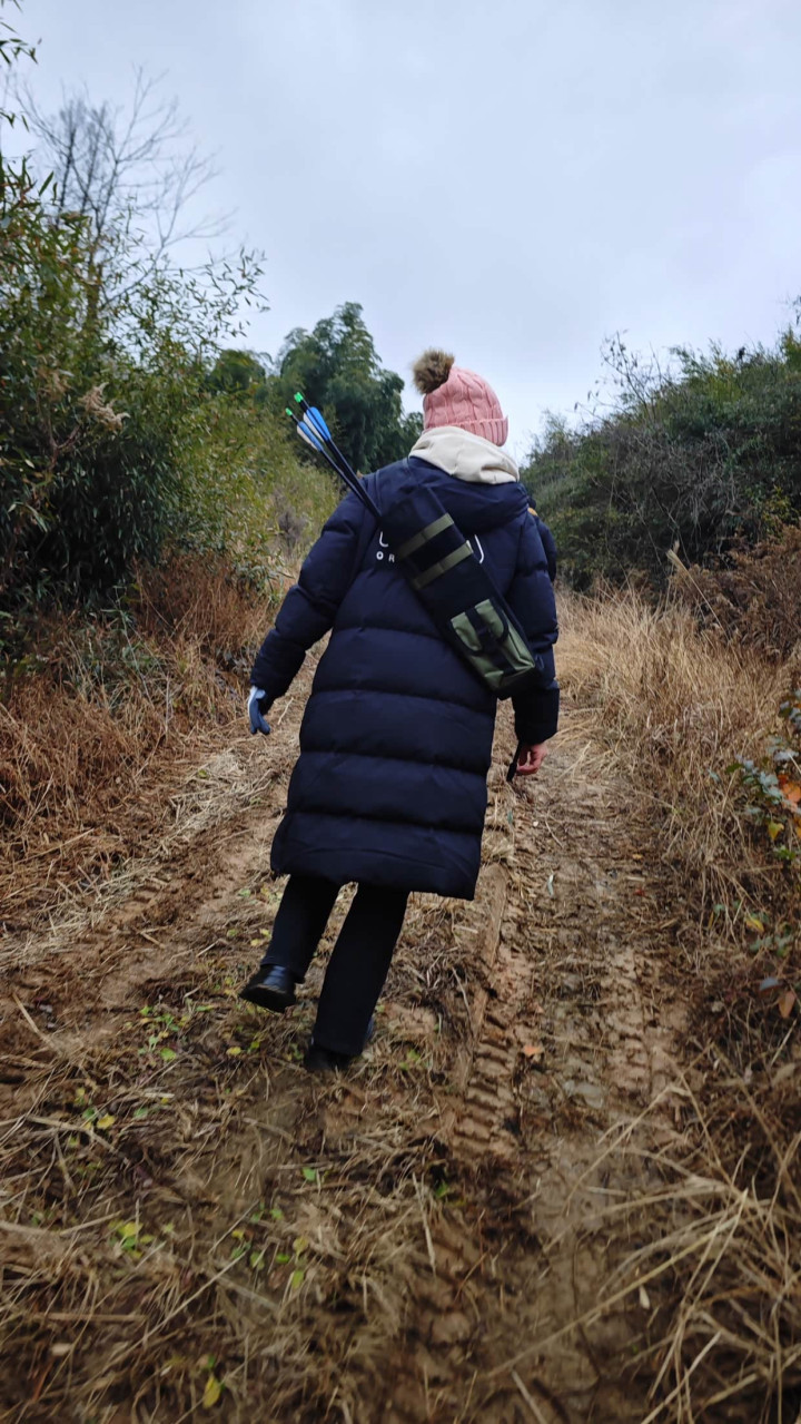 背上箭袋,拿上长弓,咱们上山打野啦!可别说,这把铝合金制作的复合弓还真挺千里,拿在手里把玩一会还不合计啥,但是拎着上山走一段山路可确切够呛,手齐酸了!