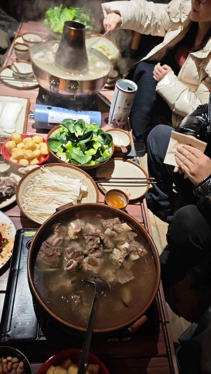 雇主拿落发传的羊肉暖锅和牛肉暖锅管待咱们!吃着暖锅,唱着歌!不亦快哉!