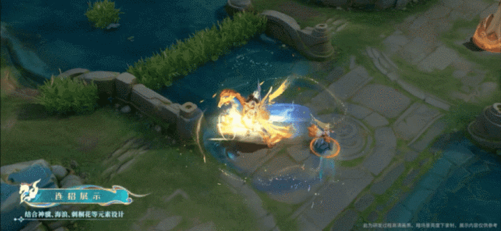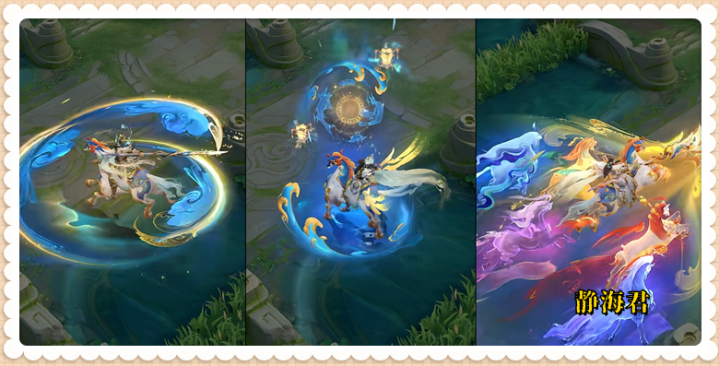 一手段横扫时,波涛会带着金色光圈显现,冲锋景象下,则是劈开巨浪,神骥跃出,船只驶出风波。