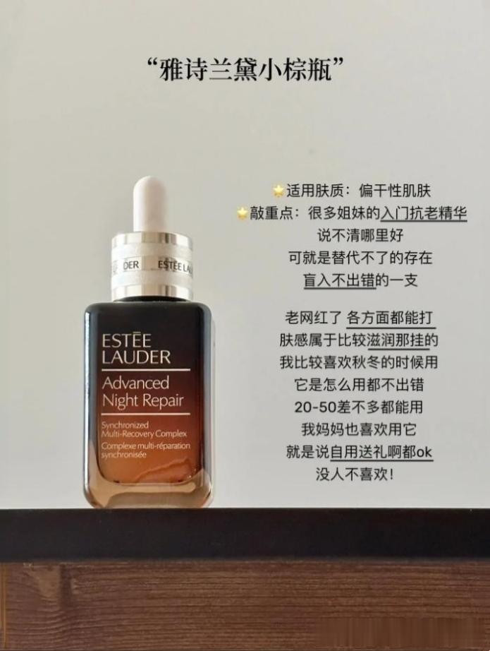 火了许多年了的小棕瓶精华,算是一款初学级的抗老的精华,主打的是抗老+保湿修护的,抗老的成果一般般,但修护维稳的成果是确切好。