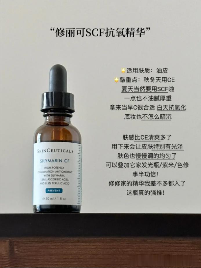 SCF精华添加15%左旋维C+0.6%水飞蓟精萃+0.5%阿魏酸,直击油皮问题,从根源减少油脂分泌,改善缄口黑头,普及皮肤考究度和紧致度,淡化细纹,内是有气压的,拿到后先放雪柜生果鸡蛋的冷藏区域 冷藏一晚再用!