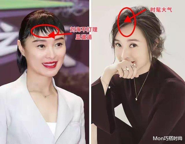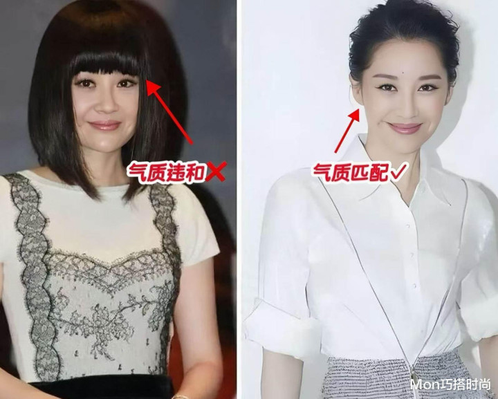 先来说为什么有的中年女东谈主剪了刘海之后,颜值反而下落了,看底下的对比我们就知谈,厚厚的一刀切刘海给东谈主的嗅觉终点的千里闷,格外不符合中年女东谈主的优雅气质,尤其是那些颜值还可以,五官比例比拟标识的中年女东谈主,剪厚刘海之后会导致五官比例被阻塞,颜值须臾就下滑了,将头发扎起来,表示额头反而更大气,也更适配你的气质。