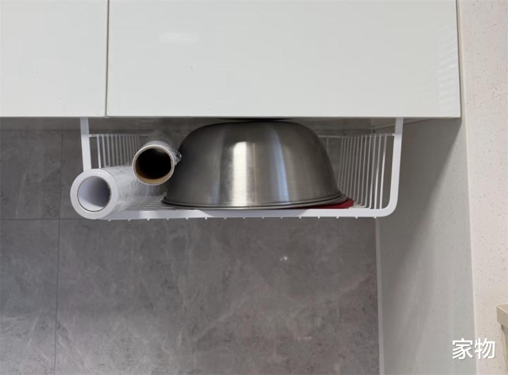 量度再三,买了这种橱柜下沿收纳架,只需要卡在吊柜的柜底,就不错收纳保鲜膜保鲜袋或者一些频频用的碗碟不锈钢盆,干净利落,拿取方便。