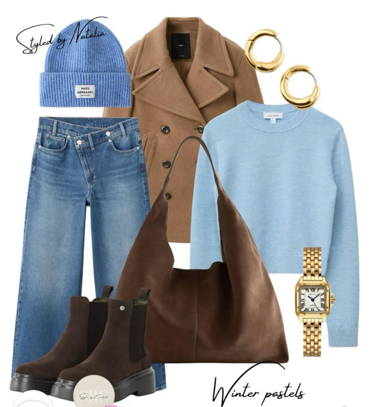 淌若你是皮肤偏黄的姐妹,就选冰调感的蓝色毛衣吧。再戴起太空蓝毛线帽,让冬日的咖色大衣也多了些亮堂感。