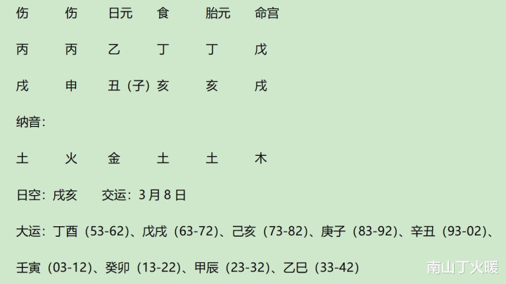 丙伤生戊财、己偏财;大运亥会子,3亥暗冲1巳,巳合申;流年午合命宫戌,小限寅与年支戌拱午。